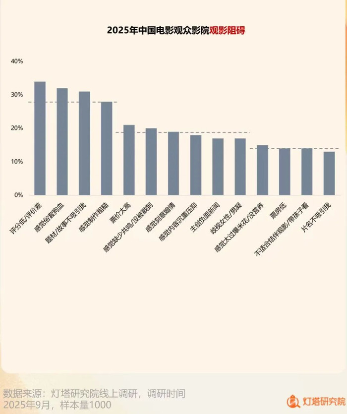 另一方面,据灯塔研究院《2025中国电影市场及观众变化趋势报告》显示,2025年观众更加追求极致的观影体验,决策明显向高口碑影片倾斜,“评分低/评价差”甚至成为影响入场意愿的头号障碍。